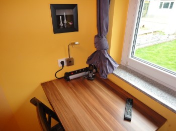 Ein Schreibtisch mit Tischleuchte, Ihrem persönlichem Funktelefon, sowie Steckdosen (auch mit USB-Ladebuchse) runden das ganze ab. |